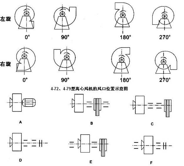 ·公司所有離心風機全部采用訂單制生產(chǎn),根據(jù)客戶的使用需求,為您量身定制,讓您買的稱心用的放心。風機分左旋和右旋兩種型式,從電機(皮帶輪)側(cè)正視,葉輪按順時針方向旋轉(zhuǎn)為右旋,逆時針旋轉(zhuǎn)為左旋。A式為點擊直聯(lián)傳動。B、C、E式為皮帶傳動,D、F式為聯(lián)軸器傳動。